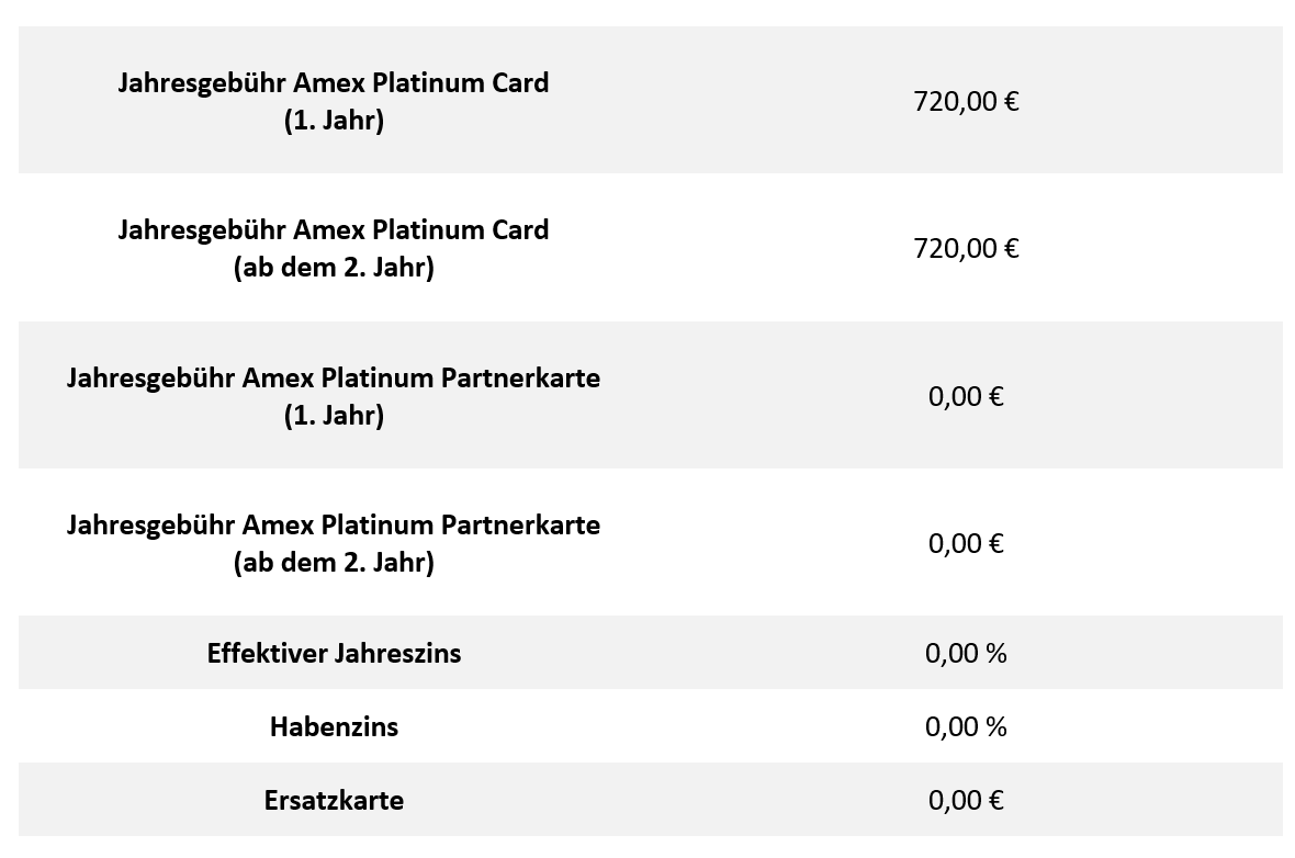 Nachfolgend haben wir Dir noch einmal alle Gebühren der American Express Platinum Card detailliert aufgelistet: